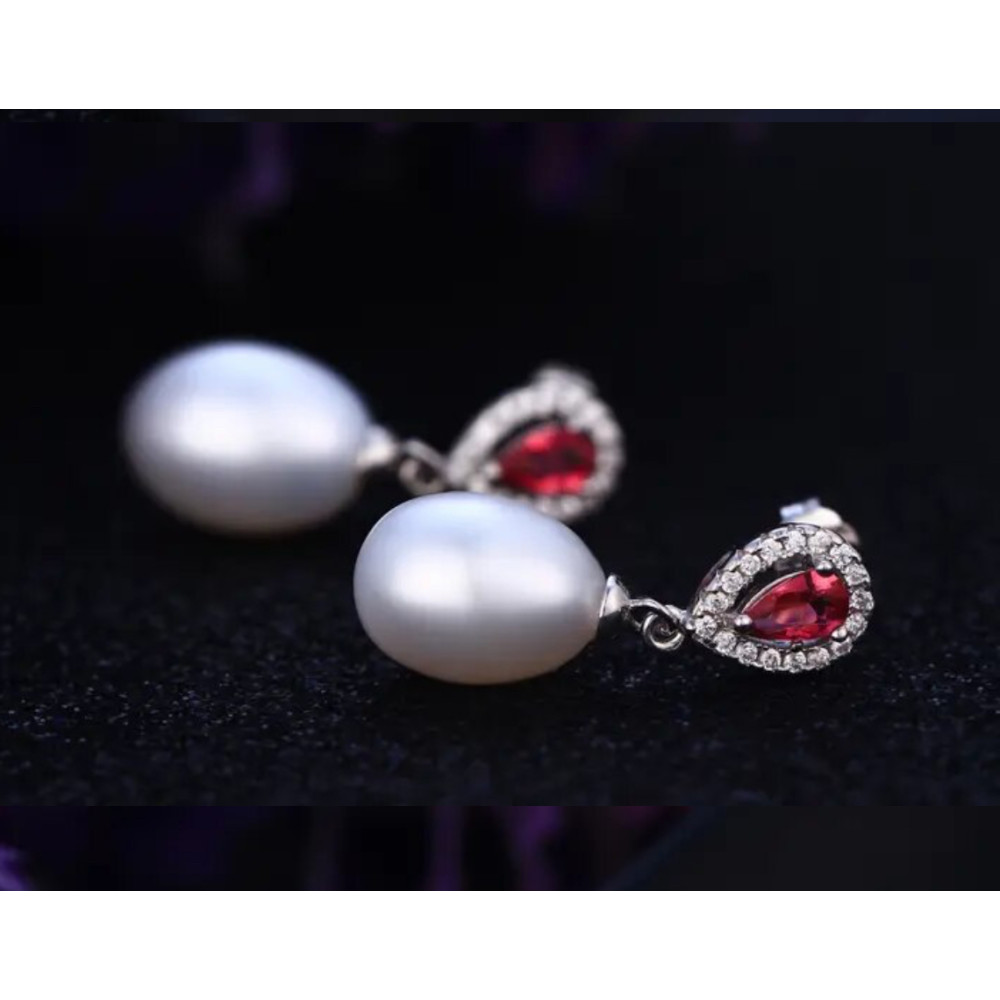 Natural Freshwater Pearl Drop Earrings with RED crystal